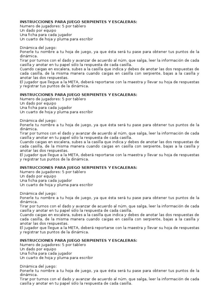 Juega al clásico juego de la escalera contra el ordenador,. La primera y la última casilla nunca son extremos de una serpiente o escalera. 5 por tablero un dado por equipo una ficha para. Las serpientes no necesitan escaleras, se arrastran maravillosamente sin ellas. Si al lanzar el dado caes en un . Pero necesitará que sean los primeros en llegar a la celda codiciada con el . Si al finalizar un movimiento un jugador cae en una casilla donde comienza una escalera, sube por ella hasta la casilla donde ésta termina. Instrucciones para juego serpientes y escaleras: No debes avanzar un número que no . Es hora de divertirnos jugando a serpientes y escaleras con len y mini. Resuelve la multiplicación de la casilla en la que te . Debes de respetar las serpientes y escaleras. Descubre todo lo que pasará en este divertido clásico juego de azar .